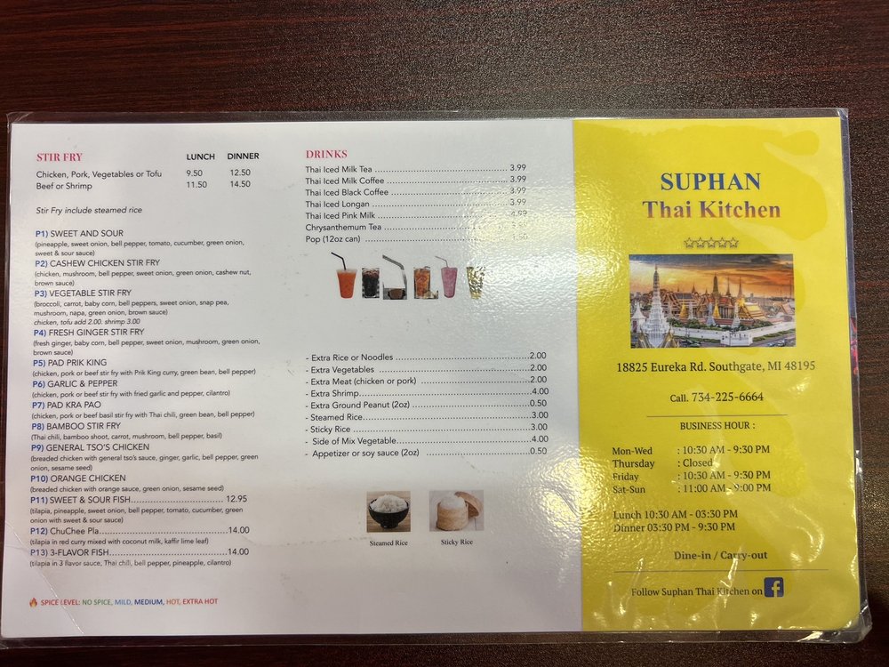 Welcome to Suphan Thai Kitchen, where authentic Thai flavors come alive in every dish. Located at 18825 Eureka Rd, Southgate, MI, Suphan Thai Kitchen offers a delightful dining experience with options for takeout and delivery, making it accessible for every palate. Their menu features a variety of traditional Thai dishes that highlight aromatic herbs, fresh ingredients, and bold flavors.